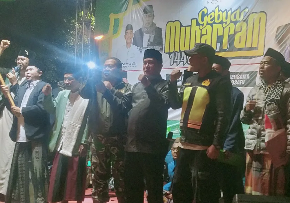 Ketua Penyelenggara Pawai Obor, MWC NU Kecamatan Tanjungsari, Dadang Faqih menyampaikan harapannya dalam kegiatan pawai obor di Alun-alun Tanjungsari.
