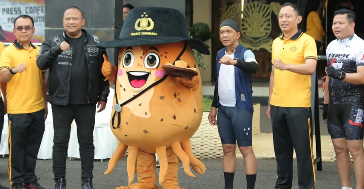Maskot UCIL (Ubi Cilembu) bersama Kapolres Sumedang, AKBP Sandityo Mahardika yang menyambut rombongan Gowes Gocapan Lodaya di Mapolres Sumedang pada Sabtu (31/1/2026)