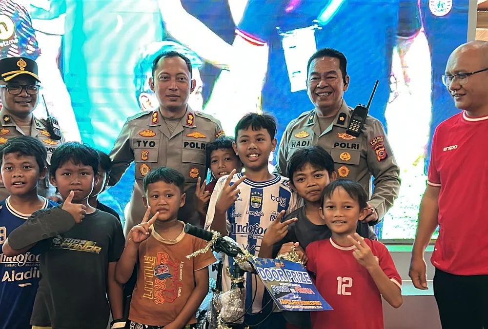 Kapolres Sumedang, AKBP Sandityo Mahardika berikan door prize kepada Bobotoh cilik yang ikut nonton bareng (nobar) Persib vs Persija di Halaman Pusat Pemerintahan Sumedang (PPS) pada Minggu (11/1/2026)